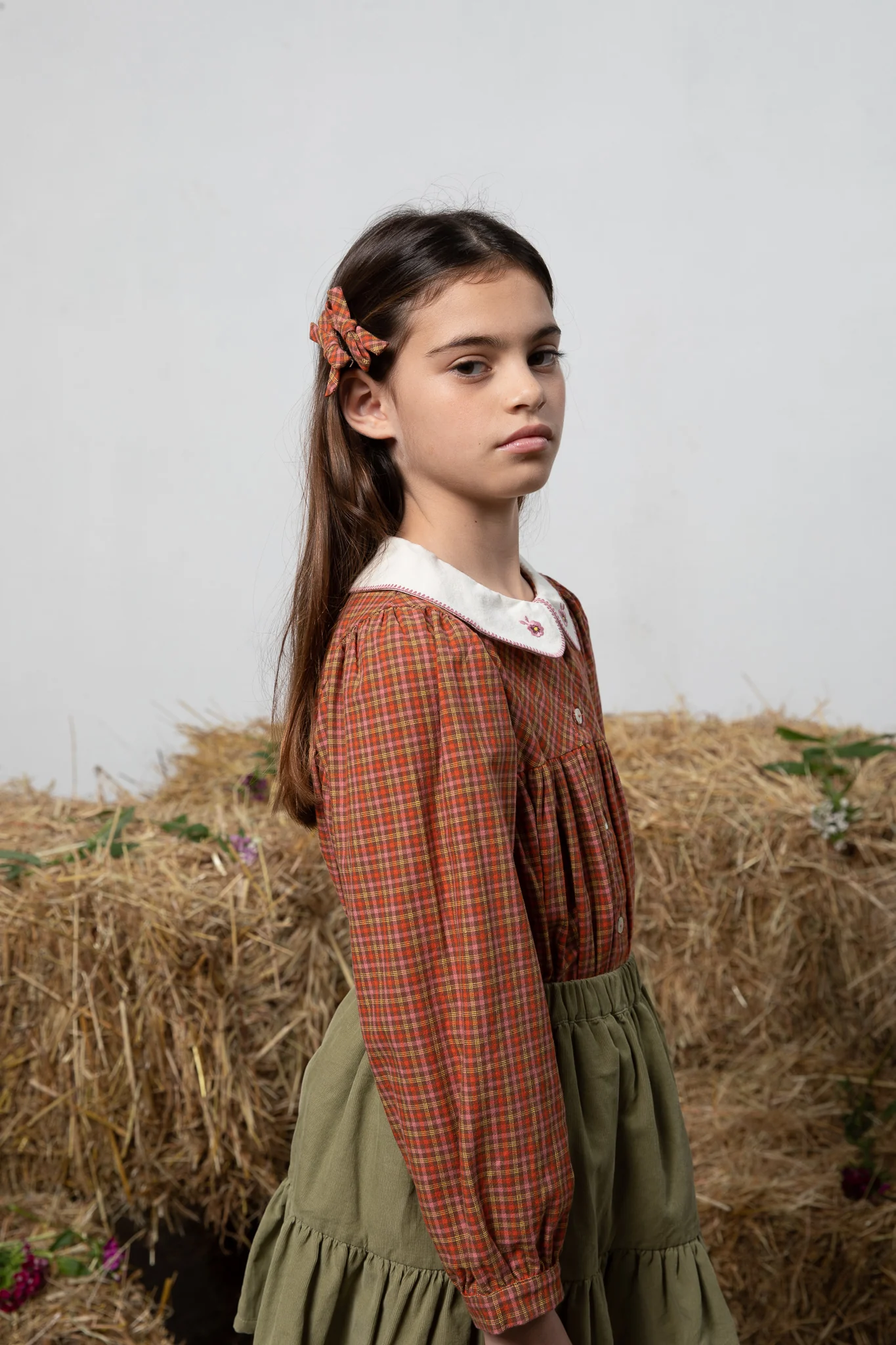 Vintage inspired Eloise blouse with adorable peter pan collar with signature floral embroidery and crochet style finish. Crafted from softest cotton in lovely multi check in hues of pink, burgundy and orange. Features puff long seeves, comfortable loose fit and front opening with mother of pearl buttons. Perfect for fall ceremonies ahead.