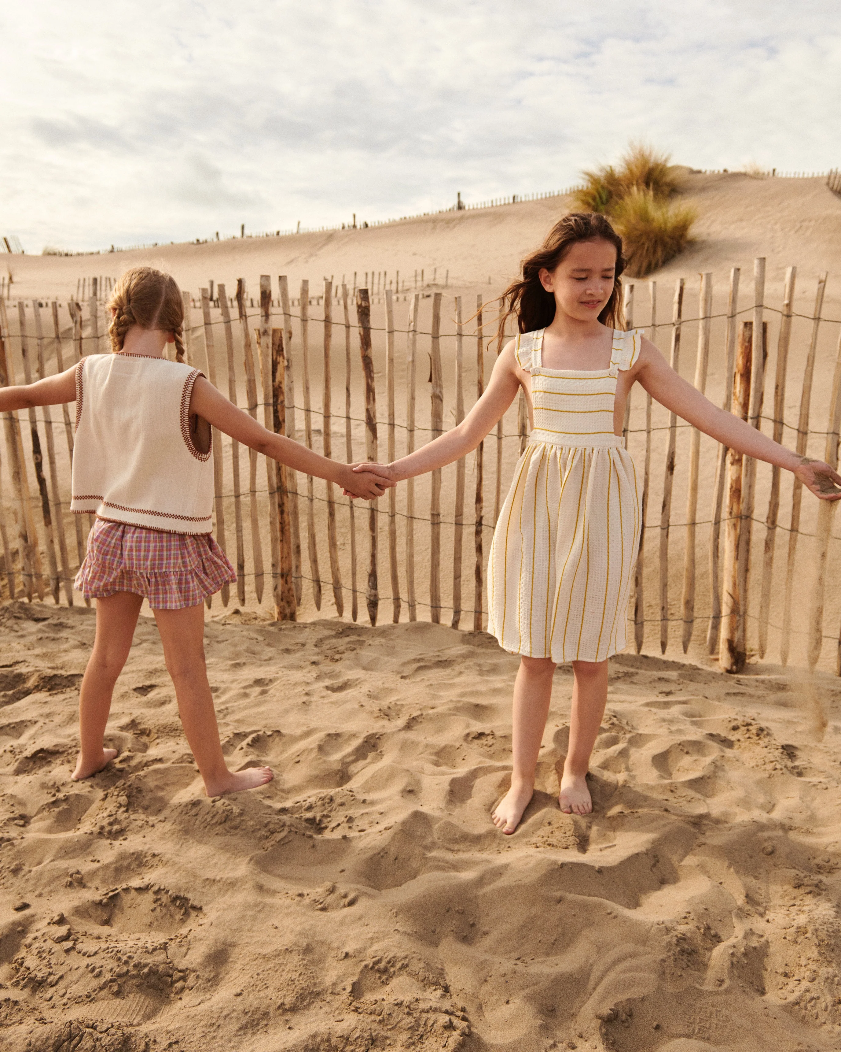 Lovely versatile Luka vest in signature vintage style needlepoint undyed natural organic cotton. Features double fabric, signature emboidery detailing and front opening with hidden button. A must have lightweight spring/summer vest. Perfect match with Faye shorts.